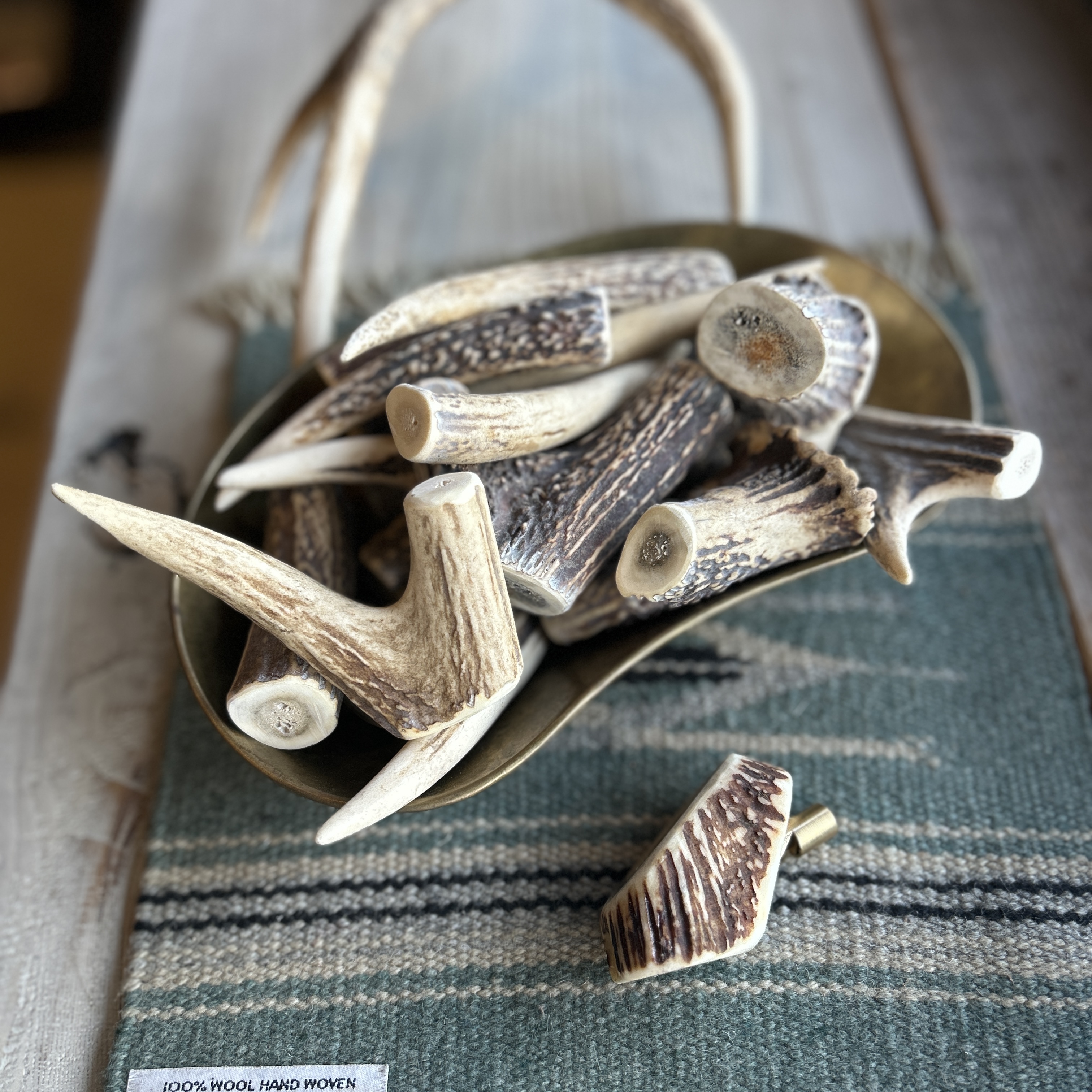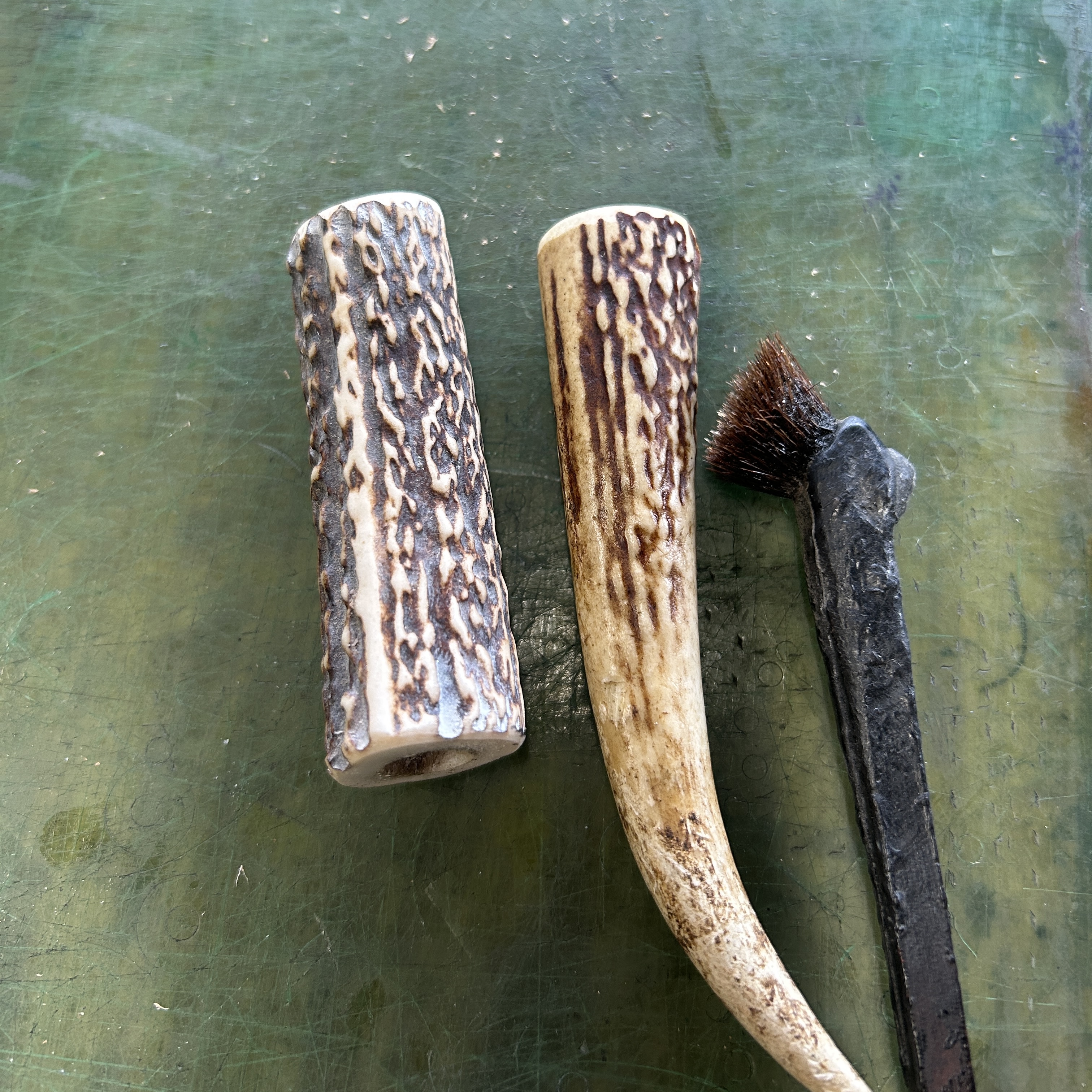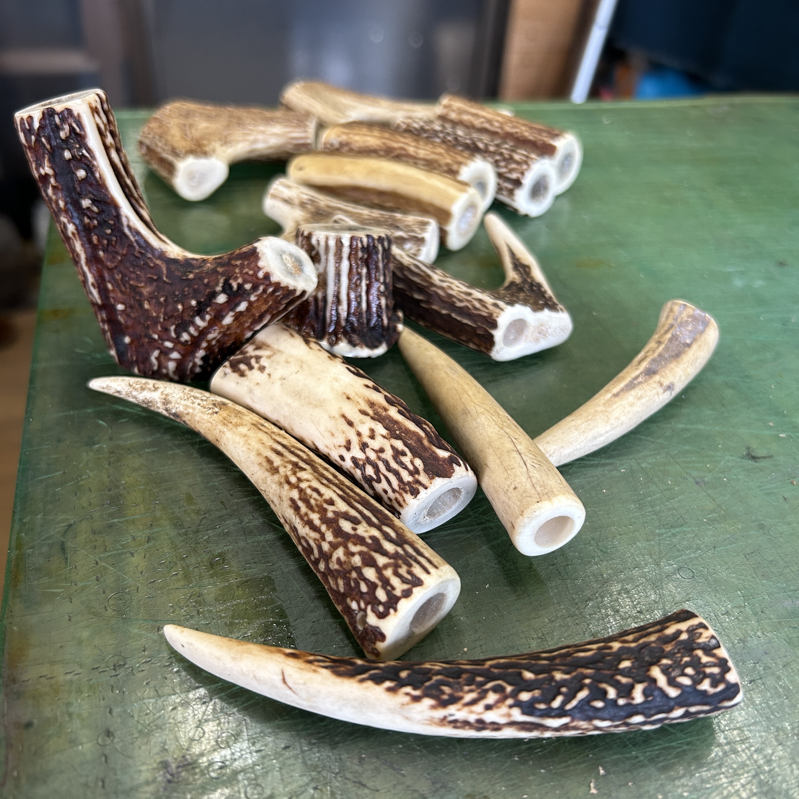 硬くて丈夫な鹿のツノは電動工具を使って切り分けられ、主に3つの種類に名付けております。先端部分の鋭利な部分はサキ(サキ)。枝分かれする部分はマタ(又)。長く伸びる幹の部分はエダ(枝)。この3つの部位に分けて販売しております。柄やバランスや形状など、二つと同じ物が無い品になります。